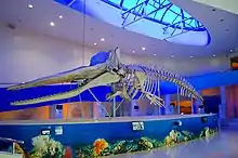 The Subangan Museum features themed exhibitions related to Davao Oriental's natural, cultural and historical heritage.[1] The museum has three dedicated section devoted to these three aspects of the province heritage.[5] The skeleton of a 16.15 m (53.0 ft) sperm whale, named Davor, serves as the centerpiece of the Subangan. The skeleton, sourced from a whale that beached in Governor Generoso, is reportedly the largest in the Philippines.[6] The culture of the Mandaya and Kalagan ethnic groups are also showcased. The museum also has a memorial dedicated to the victims of Typhoon Bopha (Pablo) which struck Mindanao in 2012, two years prior to the museum's opening.[1]