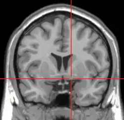 ![]() Coronal MRI slice with cross-hairs indicating location of the substantia innominata | |