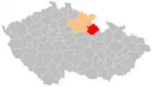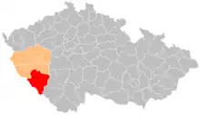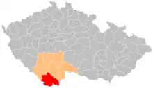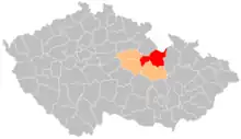 Czech districts with an ethnic German population in 1934 of 20% or more (pink), 50% or more (red), and 80% or more (dark red)[10][11] in 1935
