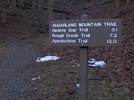 The Sugarland Mountain Trail is an American hiking trail, in the Great Smoky Mountains National Park of Sevier County, Tennessee. The trail traverses Sugarland Mountain, a massive ridge running perpendicular to the main crest of the Smokies and effectively dividing the park's north-central section from its northwestern section. Sugarland Mountain is flanked by the deep upper valleys of two of the park's major watersheds— the West Fork of the Little Pigeon River (to the east) and Little River (to the west). The trail passes through several forest types, including deciduous forest at lower elevations, heaths ("hells") along the mountain's backbone formations, and a stand of Southern Appalachian spruce-fir forest in the upper elevations. Occasional breaks in the foliage allow for views of Mount Le Conte and Sevier County to the east and Blanket Mountain and the ridges above Elkmont to the west.