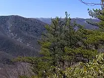 Sandstone outcroppings are not uncommon along the steep western slope of the north peak. Approximately 1 mile (1.6 km) from the campsite, a pile of large rocks allows for an unobstructed view out over the Little River Valley westward to Miry Ridge and Blanket Mountain. Beyond the north peak, the trail traverses its first substantial backbone. Gatlinburg and Newfound Gap Road are visible through the treeline to the east.