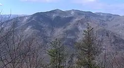 Sugarland Mountain is a ridge that consists of a series knobs and peaks, each increasing in elevation as the mountain approaches its junction with the main Smokies crest. The northernmost knobs, which overlook Fighting Creek Gap and Mids Gap, have elevations of around 3,000 feet (910 m). Beyond Huskey Gap, the mountain rises sharply to its prominent 4,833-foot (1,473 m) northern peak as the crest narrows, and maintains an elevation of 4,300 feet (1,300 m) to 4,800 feet (1,500 m) for several miles. At the headwaters of Rough Creek, the mountain rises above 5,000 feet (1,500 m) for the first time, eventually reaching 5,494 feet (1,675 m) at its summit. The Chimney Tops, which consist of two barren slate capstones, crown a narrow ridge that branches off the southeastern slope of Sugarland Mountain, opposite the Rough Creek headwaters. Sugarland Mountain's various knobs and peaks are typically connected by narrow "backbone" ridges, some of which are just a few feet wide. The relatively broad Huskey Gap— between the mountain's northern peak and its lower northern knobs— is the exception.