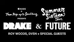 The Summer Sixteen Tour was a co-headlining concert tour by Canadian rapper Drake, and American rapper Future.[2] It began on July 20, 2016 in Austin, and concluded with its final show in Toronto, Ontario on October 8, 2016. Scheduled for 60 performances across North America, the tour was produced by Apple Music in conjunction with Drake's fourth studio album, Views, Future's fourth studio album Evol, as well as their collaborative mixtape What a Time to Be Alive. Guest appearances included Rihanna, Fat Joe, 2 Chainz, Ty Dolla $ign, Young Thug, Kanye West, and more.[3] The tour had a total gross of $84.3 million off 54 shows, making it the highest-grossing hip-hop tour of all time,[4] until he broke this record with his own co-headlining Aubrey & the Three Migos Tour in 2018.[5]