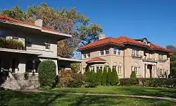 While other houses continued to draw inspiration from history a comparatively more modern style also took root on Summit Avenue, the Rectilinear Style. In this style, the architectural form moves away from previous irregular and fantastical forms and towards a more rectangular shape.[13] Houses of this style often feature elements such as overhanging eaves and casement windows but have little applied ornamentation and are relatively unpretentious when compared to other styles.[13] The Dittenhofer house at 705 Summit exhibits a move towards the Rectilinear style in its symmetry and blockish shape but cannot escape historicism in its medieval-inspired elements such as Gothic-like arched windows that were once fitted with stained glass.[13] The 1912 Beebe House in comparison is much simpler and thoroughly unpretentious in its appearance, looking almost insignificant compared to the other grand houses on the avenue. The Beebe House features no ornamentation but includes extended eaves and windows arranged in banked groups, elements also distinctive of the famous Prairie Style which was soon to become a variant of the Rectilinear.[13]