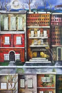 Sunday Morning is a 2013 mixed media collage by artist India Cruse-Griffin, which depicts a row of warmly-colored buildings along a city street. The work, which measures 41.25" x 28.25", framed, is made from collaged paper gathered from magazines, upon which Cruse-Griffin then paints, often allowing the underlying magazine paper to show through.[1][2] While her subjects are often clear and straightforward, this collage technique serves as a reminder of the accumulation of lived experience.[1][2]