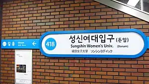 - ↑ "Sungshin Women's Univ. (Line 4)". Seoul Metro. Archived from the original on 2017-02-28. Retrieved 2017-02-24.