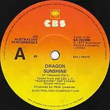"Sunshine" is a song by New Zealand–Australian rock band Dragon, released in July 1977 as the third and final single to be released from the band's third studio album Sunshine (1976). It peaked at number 36 on the Kent Music Report and remained in the chart for 15 weeks.[1]