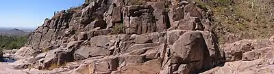 The mountain was formed by a series of volcanic eruptions between 20.5 and 18 million years ago.[16] The west face of the mountain is composed of dacite lava and rhyolitic tuff.[17] The overlying tuff was deposited during an eruption which created a collapse caldera bounded by faults. Dome resurgence reactivated these faults, causing uplift of the caldera floor which juxtaposed the softer tuff and more resistant dacite.[17] Differential weathering caused the outer tuff to erode faster, leaving the dacite cliffs exposed and creating the prominent mountain visible today.