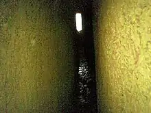Once the flow is detected, the digging of the surangas is carried out by manual labourers or by the villages themselves with the help of improvised digging tools like pick axes and wedges.[5] The digging takes places mainly during the dry season, in between February and May, to prevent collapsing of wall due to presence of moisture in the soil.[8] The tunnels are generally rectangular or dome-shaped with an optimal height and width which allows a man to work and pass comfortably.[1]:662 The tunnels are made with a downward slope to use the gravitational force for collection of the water percolating outside.[9] During construction, lining of walls is provided to prevent collapsing of wall due to loose or soft soil.[1]:662 While an average suranga is 26 metres (85 ft) meters deep,[1]:662 surangas up to 250 metres (820 ft) meters deep have also been recorded.[10] Air shafts are constructed in longer surangas to supply fresh air and to expel poisonous gases.[1]:662