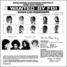 After living as a fugitive for three years, Rosenberg was arrested in 1984 while in possession of a large cache of explosives and firearms, including automatic weapons. She had also been sought as an accomplice in the 1979 prison escape of Assata Shakur and in the 1981 Brink's robbery that resulted in the deaths of two police officers and a guard,[7] although she was never charged in either case. Convicted after a trial on the weapons and explosives charges, Rosenberg was sentenced to 58 years' imprisonment. She spent 16 years in prison, during which she became a poet, author, and AIDS activist. Her sentence was commuted to time served by President Bill Clinton on January 20, 2001,[8] his final day in office.[9][10]