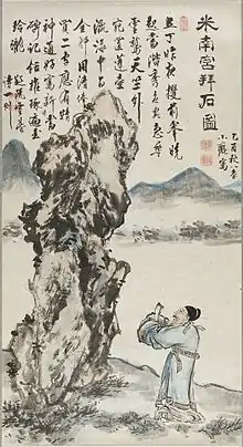 Korean artwork shows scholar paying homage to a special stone – painting with calligraphy by Hô Ryôn, 1885