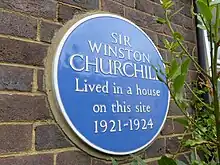 Blue plaque on the site of Prime Minister Winston Churchill's 1920s residence.
