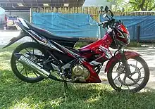 The second generation Raider 150 was introduced in 2016, with totally new design, new digital speedometer, LED headlights, reworked engine with fuel-injection and with liquid-cooled cooling system. This engine also shared with the GSX-R150, albeit with different gear ratios in the transmission, different injectors and different tuning in the ECM.[3][4] This generation also assembled with CKD kits from Indonesia in Vietnam as Raider 150 and sold together with the fully imported Indonesian built Satria 150.