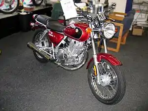 Specifications include a five speed transmission with cable-actuated clutch,[11] electric starting (with kickstarter in the JDM), clutch and side stand interlocks (cut-outs), electronic ignition system, maintenance free battery, tubular steel frame with load bearing (stressed member) engine,[8] rear drum brake and front 275mm dual-piston caliper disk brake by Tokico, chrome-plated locking gas cap, passenger pillion separate from the driver's seat, plastic front and rear fenders, factory equipped tool kit (under the right side panel),[10] helmet lock,[6] tapered chrome muffler,[10] and chrome wired wheels.[11] Cheng Shin tube-type tires are fitted as standard equipment: 90/90-18 front and 110/90-18 rear. Drive is via a 108 link, DID520V chain.