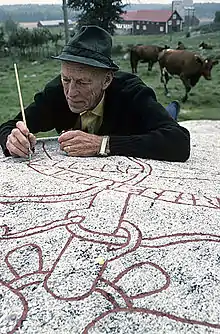 Sven B. F. Jansson painting runes on the Granby Runestone in Vallentuna in 1980.