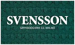Svensson is a Swedish fashion retailer, based in Malmö. It has its origins in basement clubs in the late 1990s in Möllevången. Gradually the company has grown to include graphic design and journalism, with the establishment of the Svensson Magazine in 2002. In 2005 the brand name Svensson Jeans was created. In 2010 a second store opened in Malmö.