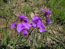 Swainsona monticola, commonly known as notched Swainson-pea,[2] is a flowering plant in the pea family Fabaceae and grows in New South Wales and the Australian Capital Territory. It is an upright or sprawling perennial with fern-like leaves and purple pea flowers.