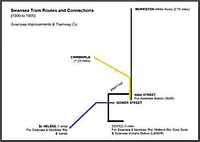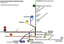 In 1905, following a failed attempt to take over the tramway, Swansea Corporation won the right to build several new lines but had to give the running powers to the SITC.[4] Glamorgan County Council, meanwhile, built an extension northwards from Morriston to Ynysforgan (intended to be a new system to Pontardawe but never completed) for which the SITC also provided the cars and electric power.[4] Three further short extensions followed in 1913 promoted by the SITC to link between some of the existing tracks to permit more route variation giving the final route pattern used from then until closure in 1937.