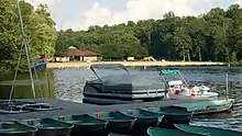 Swimming, boating, and sunbathing are permitted on the lake. Canoes, kayaks and sailboats can be rented and several boat launch and landing sites are available around the perimeter of the lake.[13][34] The park's boat launch areas permit both trailer and cartop launching, and boating with electric motors (no gasoline-powered motors) is permitted.[13] Swimming is permitted at the beach facilities during the summer from Memorial Day weekend to Labor Day weekend when seasonal lifeguards are on duty. A concession stand (operated seasonally) and bathhouse is available at the beach.[13]