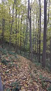 Duck Pond is a woodland vernal pool, a depression in the forest, unconnected to a stream, with a dense soil layer that impedes the water from flowing out easily. This vernal pool is a habitat for several species of plants and animal life, including wood frogs, spring peepers, and three species of salamander: Jefferson salamander (Ambystoma jeffersonianum), spotted salamander (Ambystoma maculatum); and marbled salamander (Ambystoma opacum).[23][30][31][32]