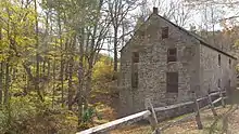 Stillwater resident George Keen (1789–1866) built a grist mill at the outlet of Swartswood Lake in 1838 at the site where Charles Rhodes, Sr. (1725–1800), built an earlier mill and milldam in 1790. Keen acquired the mill property in 1824 from Rhodes' grandson and replaced the older mill with the new mill that operated with three run of grinding stones. The mill, built of local fieldstone, was driven by a 16-foot (4.9 m) fall of water from the dam and pitchback water wheel that generated 30 horsepower. After Keen's death, his son John W. Keen (1823–1898) operated the mill for 32 years until his death in 1898.[36][37]