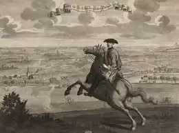On 8 September, Charles XII marched past Görlitz to Markersdorf, towards Dresden. He went through Reichenbach to Kubschütz the following day.[51] On 11 September, he bypassed Bautzen to Bischofswerda, where Augustus' Privy councillor Imhoff and Privy referendary Pfingsten arrived from Dresden to negotiate.[60] Charles XII left negotiations to his ministers, Carl Piper and Olof Hermelin, and marched past Stolpen to Radeberg on 12 September. The next day, he sent Johan August Meijerfeldt southeast of Dresden, to Sonnenstein Castle at Pirna, while he bypassed Dresden to the north,[61][62] now heading for Leipzig with its 1,600-man garrison.[1] He arrived at Weinböhla on 14 September and crossed the Elbe river at Meissen the following day.[61] The garrisons in Leipzig and Wittenberg evacuated,[63] as the Saxon ministry commended Schulenburg to retreat with the army.[33] On 17 September, Charles XII marched through Lommatzsch, Mügeln, over the Mulde river, to Grimma, where he received reports that Schulenburg's army was nearby.[63] It consisted of 2,800 infantry,[64] including 1,200 Russians,[58] and 1,800 cavalry.[64]