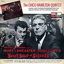 Sweet Smell of Success spanned two soundtrack LPs and two promotional singles.[4] The first soundtrack LP was released in July 1957 by Decca Records (catalog DL 8610) and featured the jazz score composed by Elmer Bernstein.[5] That same month, the lead single was released by Decca Records with the songs The Street and Toots Shor's Blues (catalog Decca 30379).[6] The second soundtrack LP featured music composed and performed by the Chico Hamilton Quintet, who also appeared in the film. Decca Records released this LP in August 1957 (catalog DL 8614) and promoted it with a single by Mark Murphy featuring Goodbye Baby on the A-side and The Right Kind of Woman on the B-side (catalog Decca 30390).[7][8]