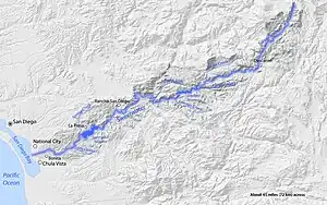 From its headwaters high in the Cuyamaca Mountains, the river flows generally southwest, first through rugged hinterlands but then into the urban areas surrounding its mouth at San Diego Bay. Its drainage basin covers more than 230 square miles (600 km2), all of it within San Diego County. Towns on the river include Descanso, La Presa and Chula Vista.