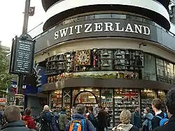 The Swiss Centre was a popular tourist attraction on the edge of Coventry Street, London, at its junction with Leicester Square. The 14 storey building[1] was both a showcase for Switzerland and its products, and a trade and commercial centre that featured a Swiss bank, tourist office, a chocolate and souvenir shop, a Swissair ticket office, a cafe and several Swiss themed restaurants which were located in the basement.[2]