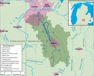 Sycamore Creek is a tributary of the Red Cedar River in the state of Michigan in the United States. The stream is 26.5 miles (42.6 km) long[4] and drains an area of 106.1 square miles (275 km2)[5] on the central Lower Peninsula, in and around the city of Lansing. Via the Red Cedar River, it is part of the watershed of the Grand River, which flows to Lake Michigan. Via Lake Michigan and the Great Lakes system, it is part of the larger watershed of the St. Lawrence River.