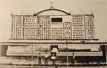 In 1896 the Ladies' Stand was opened, along with a concrete cycling track which circled the inside of the ground.[3] One of the carpenters who built the formwork for the track was George Bradman, father of Don Bradman. In 1898 floodlights were built over the cycling track so that night events could be held. In 1904 the scoreboard was rebuilt at the top of The Hill and in 1909 the Sheridan Stand, named after Phil Sheridan, was opened at the southern end, replacing the earlier Smokers' Stand.