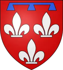 Gules, 3 fleurs de lis argent couped, accompanied in chief by a label of three points azure.