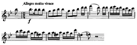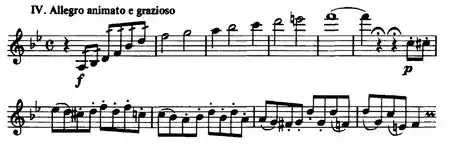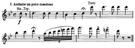 Originally, each movement had its own title, with the first movement nicknamed "The Beginning of Spring", the second "Evening", the third "Merry Playmates", and the last "Spring in Full Bloom". However, Schumann withdrew the titles before publication.[8] The first movement was described by the composer as a "summons to awakening", and "The vernal passion that sway men until they are very old, and which surprises them with each year."[9] One scholar wrote that "If that makes this a kind of Last Judgment, then the rest of the symphony is a Garden of Heavenly Delights."[10] The first trio of the third movement quotes motifs from the first movement. The last movement of the symphony also uses the final theme of Kreisleriana, and therefore recalls the romantic and fantastic inspiration of the composer's piano compositions.