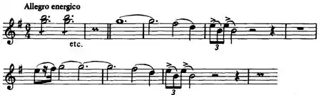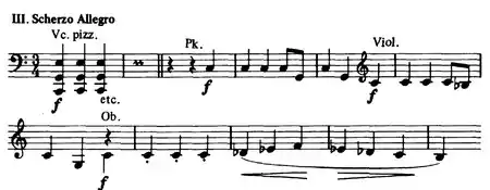 This movement contains a number of tones that lead to a rumbling effect due to intermodulation distortion.[6] It starts with a serious and emotional strings unison with brass strikes, using the introduction from the first movement, then soon proceeds into a fantasia with nearly free form.