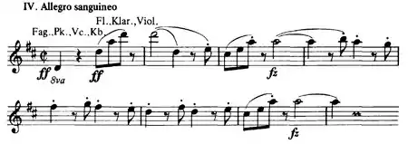 I have tried to sketch a man who storms thoughtlessly forward in the belief that the whole world belongs to him, that fried pigeons will fly into his mouth without work or bother. There is, though, a moment in which something scares him, and he gasps all at once for breath in rough syncopations: but this is soon forgotten, and even if the music turns to minor, his cheery, rather superficial nature still asserts itself.[7]