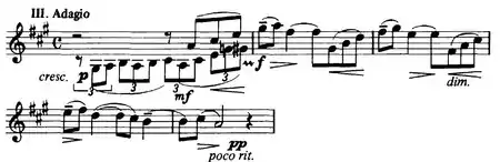 The intensity subsides, and the central melody of the third movement is restated, this time played by the first violins, while fragments of the opening theme are heard in the accompaniment. The Dies Irae motto is restated again apparently to bring about an ending to complement the first movement introduction, as the third movement concludes in a tranquil fashion dying away slowly in the strings.