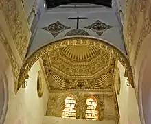 As a result of the pogroms of 1391 and the anti-Jewish preaching of Vicente Ferrer, the synagogue was sacked and then appropriated by the Catholic church.[8] It was officially consecrated as a church in the early 15th century, though sources vary in stating the exact year: some cite 1401,[9] 1405,[10][5] 1410,[11] or 1411.[5][8] The church was given to the Order of Calatrava.[11] Its present name, Santa Maria la Blanca ('Saint Mary the White') dates from this time and comes from an effigy of Mary that was kept inside.[9] Between 1550 and 1556 three small apses were added to the back of the building to serve as chapels, still visible today. They are designed in a Renaissance style and are attributed to Alonso de Covarrubias.[11][9]