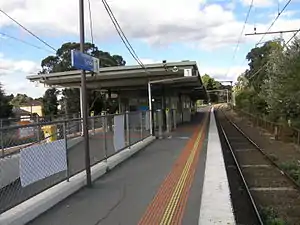 Syndal railway station is a commuter railway station in the suburb of Glen Waverley in the south east of Melbourne, Victoria, Australia.[4] The station opened in 1930 as a part of the extension from East Malvern to Glen Waverley.[5] The station consists of a single island platforms which is connected to Hunter Street and Coleman Parade via a pedestrian subway.[4]