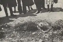 On the morning of May 18, 1943, a punitive expedition composed of German gendarmes and members of the Ukrainian Auxiliary Police[lower-alpha 1] from Biłgoraj and Tarnogród arrived in Szarajówka.[1] Around 9:00 a.m., villagers noticed the village was encircled, sparking panic among them. Soon after, the Germans and Ukrainians entered the village, forcing residents out of their homes and gathering them in the square opposite farmer Saniak's farm.[6] Initially, women and children were treated with some leniency, while men endured harsh interrogations in attempts to extract information about Polish partisans.[7][8] Several individuals suffered severe beatings, rendering them unable to walk to the execution site unaided.[9] Meanwhile, the assailants looted livestock and valuable belongings from the farms.[8]