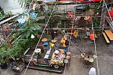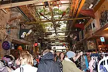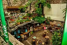 Szimpla Kert is a ruin bar or romkocsma, which means "Simple Garden" in Hungarian, located in the Jewish Quarter of the 7th district of Budapest, Hungary.[1] It is considered the pioneer of ruin bars.[2][3] The pub started as a place for people to find a cheap drink in a relaxed environment, but has grown to become a tourist attraction and community center. Movie showings, live music performances, an art gallery, the Kazinczy Living Library, the Szimpla Farmers' Market, and the Szimpla Bringa bicycle flea market are just a few of the community activities that are held at the bar.[4]