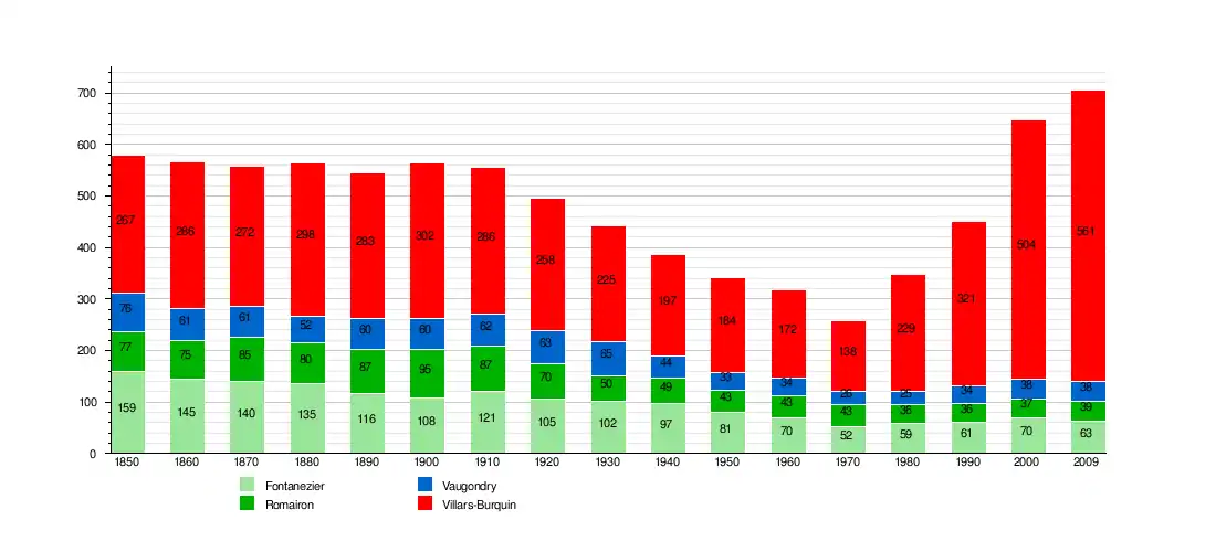 As of 2009, Tévenon had a population of 696 people (556 in Villars-Burquin, 38 in Vaugondry. 39 in Romairon and 63 in Fontanezier) of which 88% are Swiss and the remaining 12% are of foreign origin. 15% of the total population are under 18 years old.[6][10]