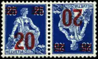 In philately, tête-bêche (French for "head-to-tail", lit. "head-to-head") is a joined pair of stamps in which one is upside-down in relation to the other,[1] produced intentionally or accidentally. Like any pair of stamps, a pair of tête-bêches can be vertical or horizontal. In the case of a pair of triangular stamps, they cannot help but be linked "head-to-tail".