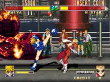 Attacks include standard punches and kicks as seen in many fighting games, but also includes special moves, and special techniques.[1] Unique to the game however, is a system called "reverse combo correction" by fans and one of the planners who is inexperienced in fighting games. In a typical fighting game, as combo attacks are chained together, the damage decreases. However, in this game, the damage actually increases as the combo is chained. This results in each characters being able to carry out combos that instantly kill the opponent.[3] Another feature is "homing jumps", which are special jumps which thrust you into your opponent.[4][2] Game modes in the PlayStation port include "Arcade mode", "VS mode", "training mode", and "story mode".[1]
