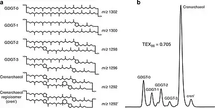 Based upon the relative distribution of isoprenoidal GDGTs, Schouten et al. (2002)[6] proposed the tetraether index of 86 carbon atoms (TEX86) as a proxy for sea surface temperature (SST). GDGT-0 is excluded from the calibration as it can have multiple sources [7] while cren is omitted as it exhibits no correlation with SST and is often an order of magnitude more abundant than its isomer and the other GDGTs. The most recent TEX86 calibration invokes two separate indices and calibrations:[8] TEX86H uses the same combination of GDGTs as in the original TEX86 relationship: