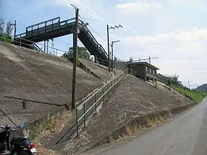 The station consists of two side platforms serving two tracks on a side hill cutting. A steep sloping ramp leads up to the station from the access road. The station building is a simple, functional, brick structure which is unstaffed and serves only as a waiting room. Access to the opposite side platform is by means of a footbridge.[2][3]