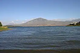 The lake has a volcanic-tectonic origin.[5] The lake is surrounded by the volcanic mountains. From December until March lake is frozen over. Coastline is partially indented.[6] There are many bays and several islands.[4]