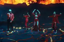 The music video for "Taki Taki" premiered on 9 October 2018 on DJ Snake's YouTube channel. The video was directed by Colin Tilley. A short teaser clip was shown at the 2018 American Music Awards.[15] The video is set in a post-apocalyptic world.[16] The clip transitions with various landscapes showing the quartet together with a volcano in the background and in the solo scenes. These scenes include DJ Snake out in the storm near a Range Rover, Ozuna in a women-filled pit, Cardi B wearing a black bodysuit covered by a black cape accompanied by dancers, and Gomez in a green monochromatic outfit in the forest.[17][18] It became the fifth fastest video of 2018 to reach 100 million views, and ranked among the top 10 fastest overall.[19] "Taki Taki" made Ozuna the artist with the most 1 billion-view videos on YouTube, with over seven videos.[5] As of August 2022, the video has received over 2.3 billion views on YouTube.[20]