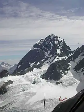 The north face is composed of steep rock and snow with a glacier and the south portion of the mountain is composed of rock gullies and snow. The east face has an impressive relief of 1000 or more meters of technical terrain.[4]