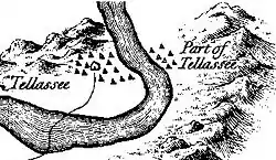 Perhaps because of its remote location in the high mountains, Tallassee received little attention from explorers, traders, and diplomats throughout the 18th century. The village appears on George Hunter's 1730 map of the Cherokee country, along with Citico and Tanasi. The "head man" of Tallassee was one of several Overhill and Middle town chiefs who met with Colonel George Chicken at the Tanasi townhouse in 1725 to forge an alliance against their competitors the Creek.[2] Tallassee again appears on Henry Popple's 1733 Map of the British Empire in North America, along with Citico and Tanasi. In 1751, South Carolina records list Tallassee as one of seven Overhill towns. The same seven are shown on John Mitchell's 1755 map of North America.[3] Europeans recorded as Cherokee towns those settlements with a townhouse, their form of public architecture. It was a communal meeting place for people in the town, and the place where they received outsiders.