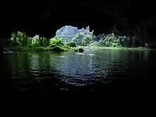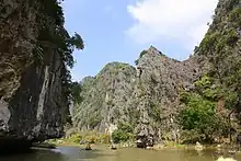 Tam Cốc, literally "three caves", consists of three natural caves Hang Cả, Hang Hai, and Hang Ba on the Ngô Đồng River.[2][3] Tourists are taken in small boats along the river from the village of Ván Lám, through rice fields and limestone karsts, through the caves, and back. Local women serve as guides and attempt to sell embroidered goods to their passengers. The guides are well known for rowing their boats using their feet.[4]